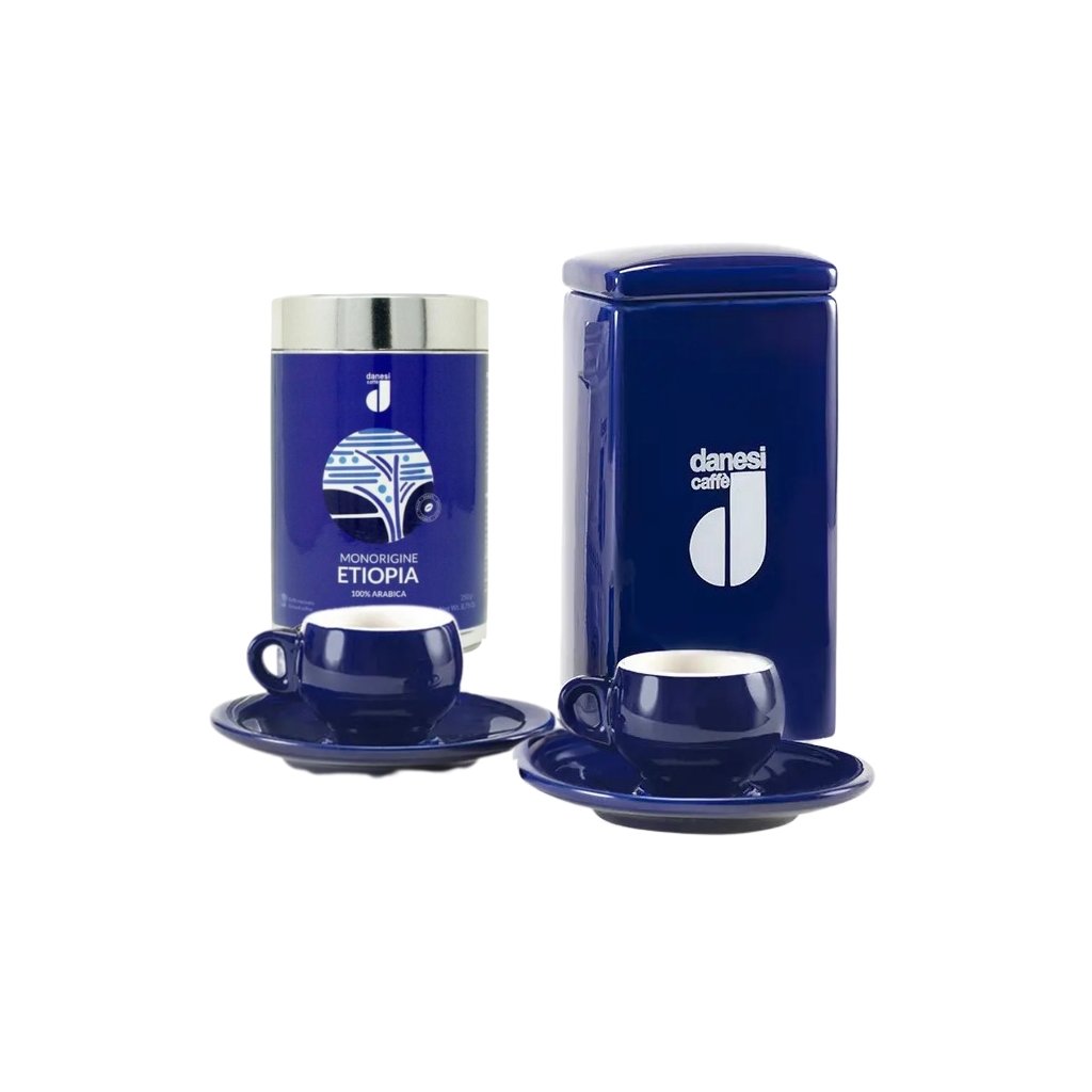 Danesi Duo Plus szett Kék Etiópia gabona - sötét kávébab kazetta 250 g + 2 csésze és 2 csészealj - kék