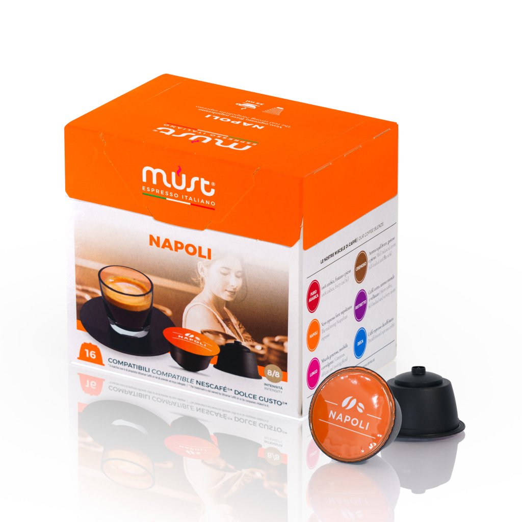 A Dolce Gusto Must Napoli egy igazán erős személyiség! Az igazi nápolyi eszpresszó összetéveszthetetlen és krémes íze. Összetétele 10% Arabica 90% Robusta kávéból áll, a markáns ízt a keverék nagyrészét kitevő Robusta kávénak köszönheti. A válogatott rangos, afrikai kávébab éles tónusait diadalmasan egészíti ki a brazil kávébab teljes aromája és meleg ölelése sűrű amely krémes rétegben teljesedik ki.