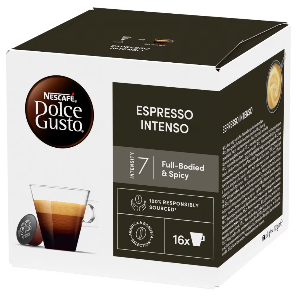 A Dolce Gusto Nescafé Espresso Intenso Caffé egy nagyon intenzív és aromás eszpresszó, testes és bársonyos állaggal. Állagát és színét a sötétre pörkölt Arabica és Robusta kávébab határozza meg.