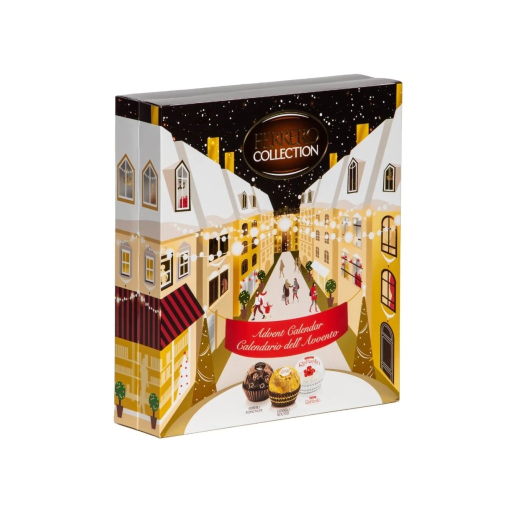 Háromféle Ferrero praliné kollekció díszdobozban. Ferrero Rocher, Ferrero Rondnoir és Raffaello.