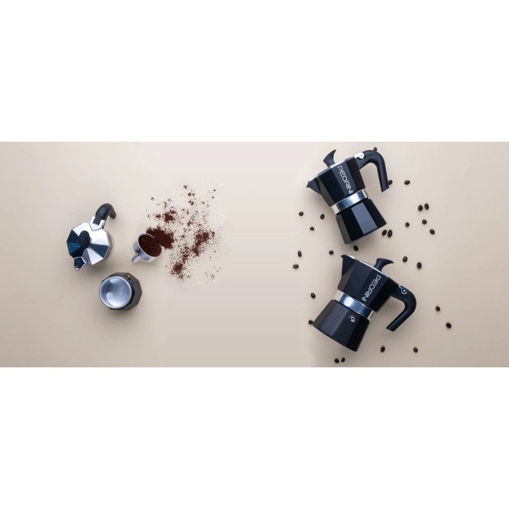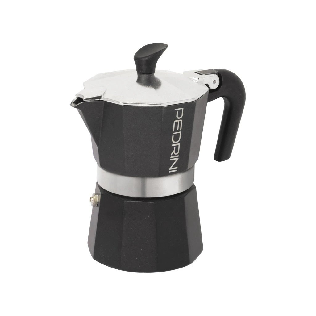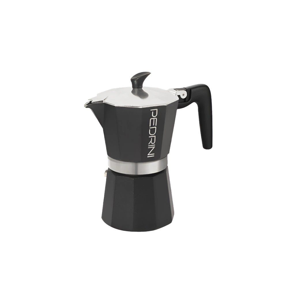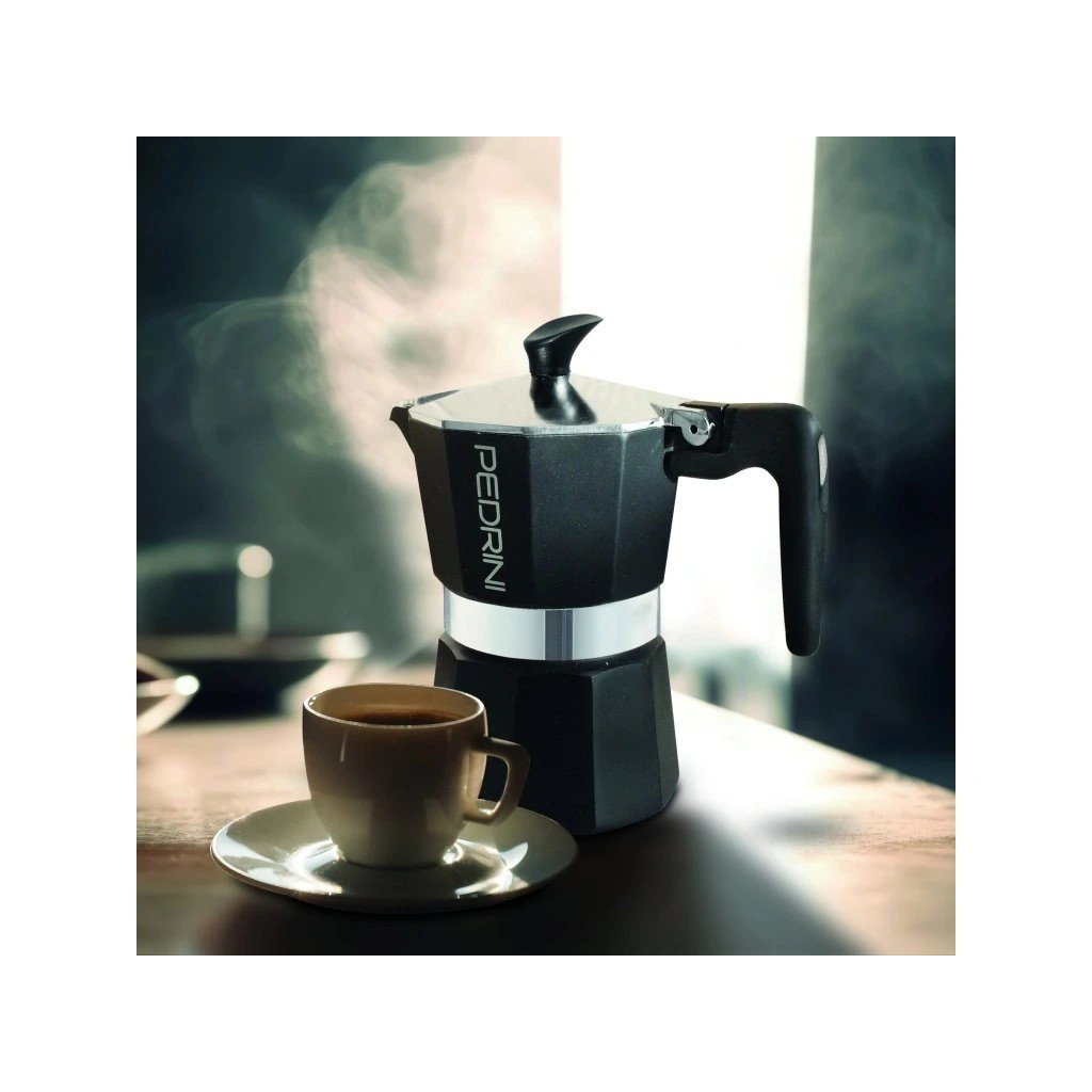 A Pedrini Aroma egy jellegzetes, teljesen fekete dizájnú mokkafőző, amelyet az olasz Pedrini márka tervezett a különleges stílus szerelmeseinek. EN601 élelmiszeripari minőségű alumíniumból készült , amely rendszeres használattal finom patinát képez, gazdagítva az elkészített kávé ízét. Az ergonomikus, hőálló fogantyú és a fedél fogantyúja tartós műanyagból készült, amely akár 210 °C- ig hőálló . A kiváló minőségű biztonsági szelep biztosítja a biztonságos kávéfőzést a túlnyomás kockázata nélkül. A kanna elektromos, üvegkerámia és gáztűzhelyhez készült , indukciós főzőlaphoz nem.