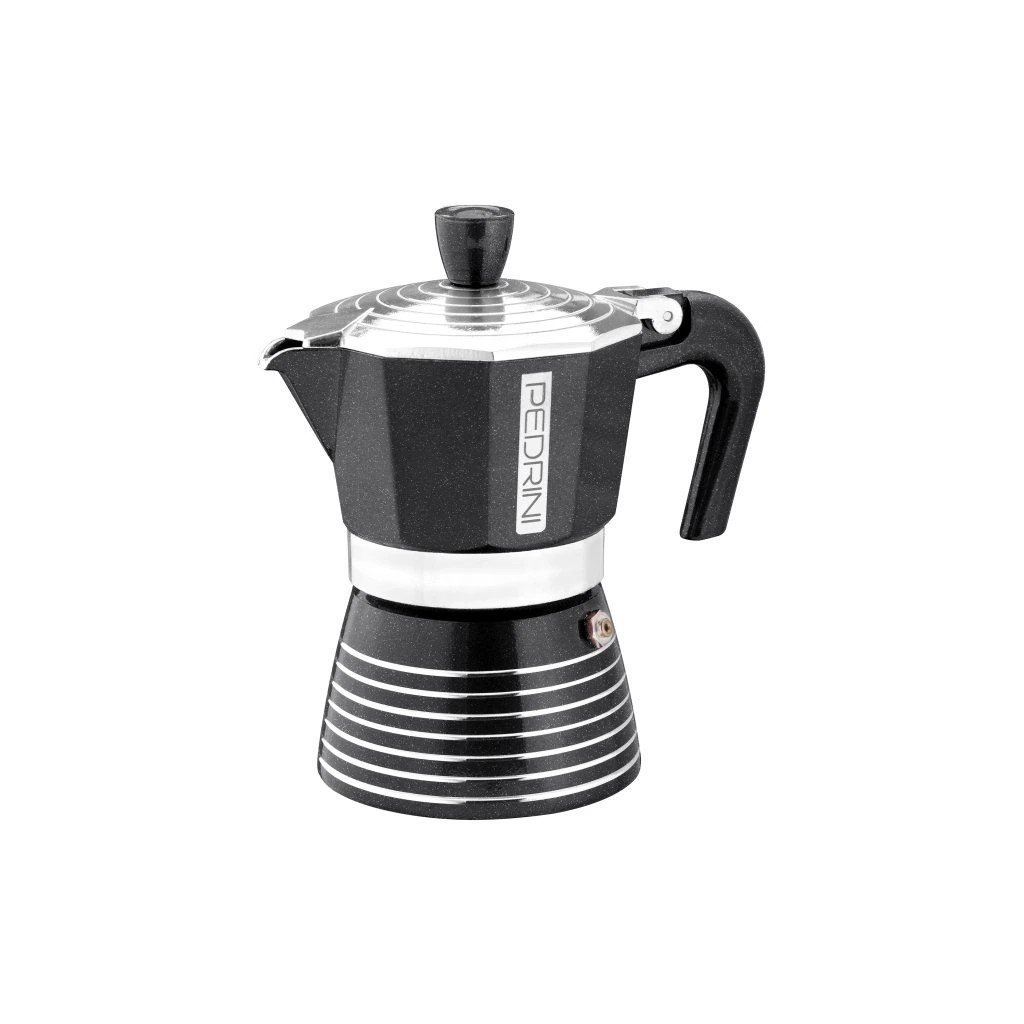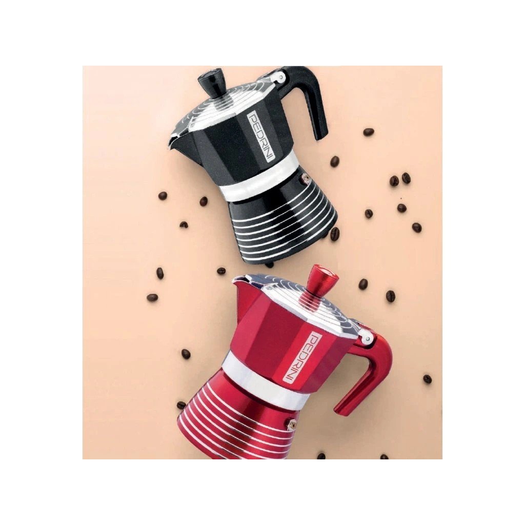 Az olasz Pedrini márka Infinity márkája egy stílusos mokka kannája, amely prémium minőségű, élelmiszeripari alumíniumból készült. Felületét csillogó , hőálló máz díszíti , amely megvédi az anyagot a kifakulástól és a minőségromlástól még hosszú távú használat esetén is. A fedél és az alj elegáns, kör alakú mintái olyan megjelenést kölcsönöznek a kannának, amely nemcsak téged, hanem minden látogatót is elkápráztat.